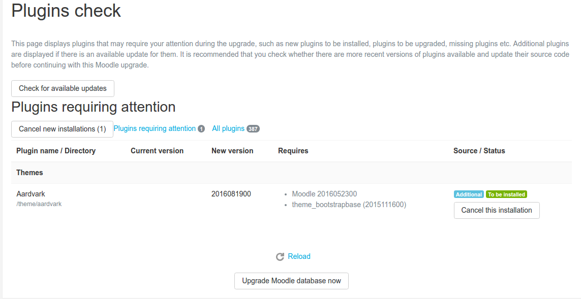 Then click ‘Upgrade Moodle database now’ button. ATTN: SOMETIMES THE PROCESS TO UPGRADE THE DB IS SLOW (FOR CAMPUS THEME)!