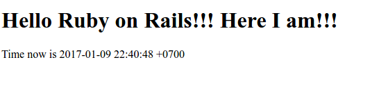 <h1>Hello Ruby on Rails!!! Here I am!!!</h1> <p>Time now is <%= @time_now %></p> |