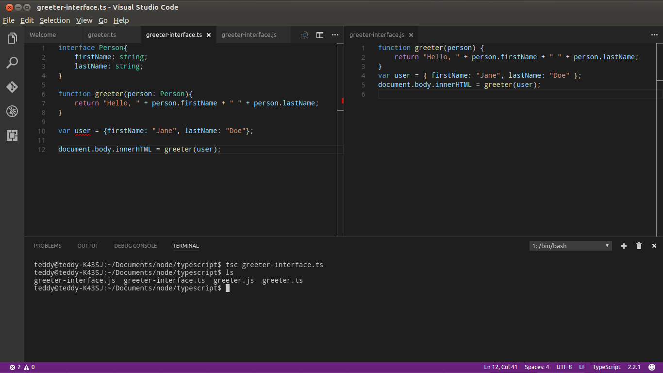 It’d create a new js file: greeter.jsgreeter.js has same content with greeter.ts.