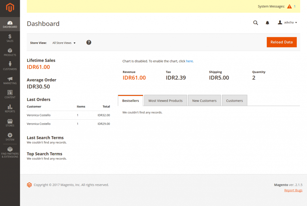 When ‘Launch Magento Admin’ button is clicked, it’d go to the admin page (http://localhost/works/magentoce215/admin_dgj2ff).Use your correct username and password to sign in. Here is the main admin page.Somehow I got an error like this:“One or more indexers are invalid. Make sure your Magento cron job is running.”. I think no need to worry right now.