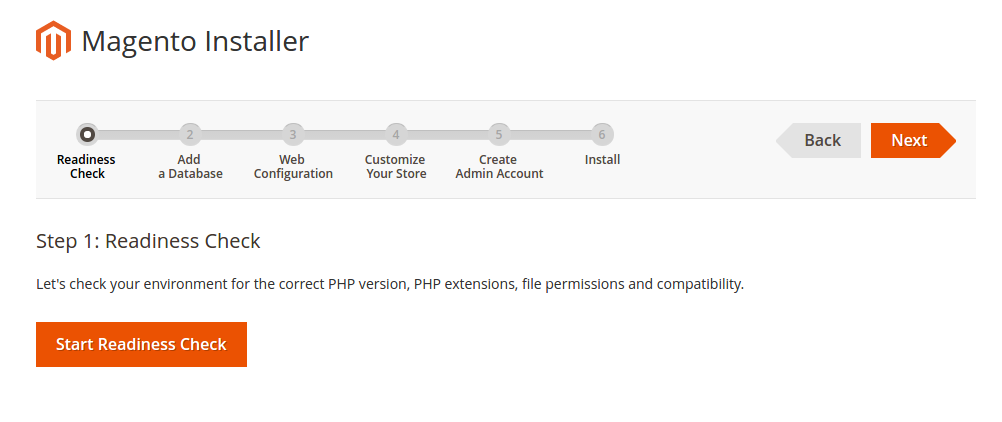 4. Open it the first time on your browser: http://localhost/works/magentoce215. It’d setup magento for the first time.Click ‘Agree and Setup Magento’ button. It’d bring us to next step, the check install page. Here is the looksI want to make sure anything would be okay so I click ‘Start Readiness Check’ button. It’d check my php version and the php extension I have. It seemed I miss some extensions. Here is the result.I need to sort its out first. Install the missing php extensions.