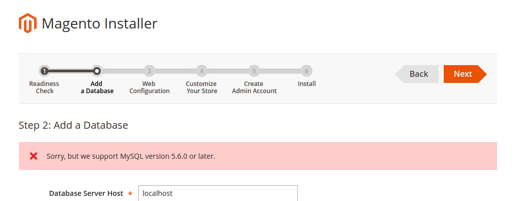 Back to the browser then click ‘Try Again’ button at the top of the page. If everything okay, I’ll get this page.Then click ‘Next’ button. It’d bring you to the database setting page. That is my database setting. I already created a new database ‘magentoce215’ (utf8-general-ci) via phpmyadmin. Make sure the setting is correct! Then click ‘Next’ button. Oops! I have MySQL Server 5.5.54 that not supported by magento ce 2.1.5. It recommended to use MySQL 5.6.0 or later!SO I NEED TO UPGRADE THE MYSQL VERSION TO MYSQL 5.6.0 OR LATER? OK. I upgraded my MySQL server to 5.7 version. Now everything is fine. Then I got this screen about my local magento web configuration.magento url: http://localhost/works/magentoce215/