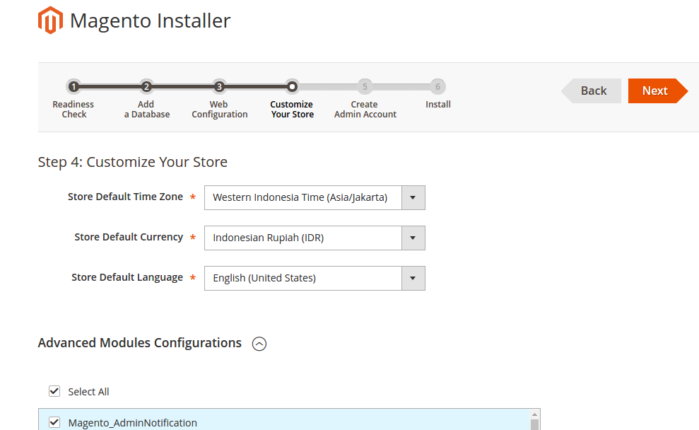 Then click ‘Next’. Then I modify my store setting like this:I checked ‘Select All’ for ‘Advanced Modules Configuration’ because I want to use the samples data. Then click ‘Next’. Then fill out the admin form.SORRY, ONLY ADMIN CAN SHOW THIS!