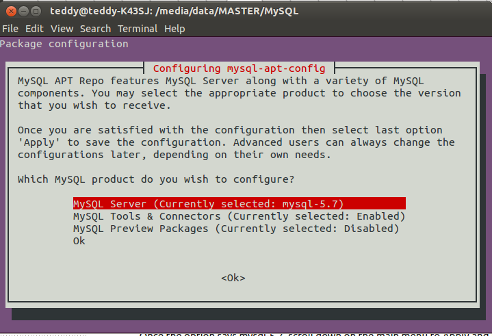 Then I’d got the second screen.Select ‘mysql-5.7’ then ‘ok’. Then if you get to the first screen again, just select ‘Ok’ and ‘ok’. The screen would be closed.