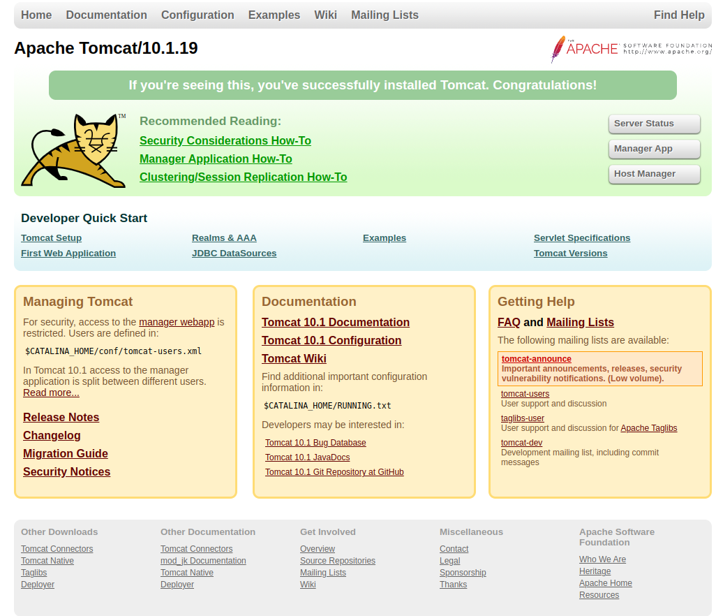 AT THE TIME, THE LATEST STABLE VERSION IS 10.1.19. DOWNLOAD THE BINARY (https://dlcdn.apache.org/tomcat/tomcat-10/v10.1.19/bin/apache-tomcat-10.1.19.tar.gz)