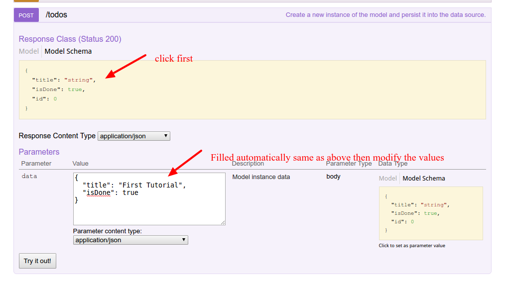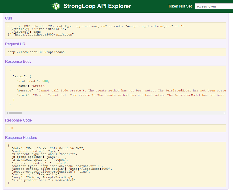 http://localhost:3000/explorer/:Lest try to create a new post. Click ‘POST’ from the above explorer or http://localhost:3000/explorer/#!/Todo/Todo_createThen click ‘Try out!’ button. Here is the response:I also got the error in my terminal.